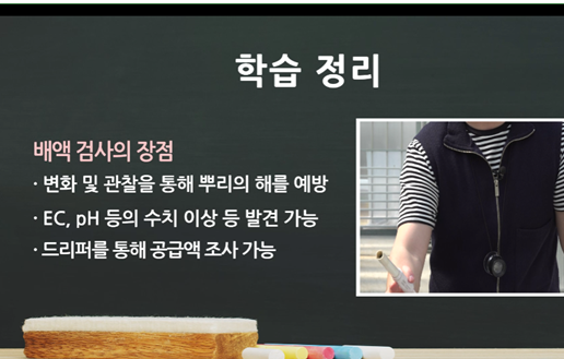 관수량 자체는 환경제어 프로그램에 데이터를 기록한다. 그러므로 우리는 배출하는 배액량만 체크하면 된다. 배액 검사를 하면 변화를 관찰해서 뿌리의 해를 예방할 수 있고 드리퍼의 효율을 늘릴 수 있다. 드리퍼에 비커만 설치하면 공급액의 수질 검사를 진행할 수 있다.