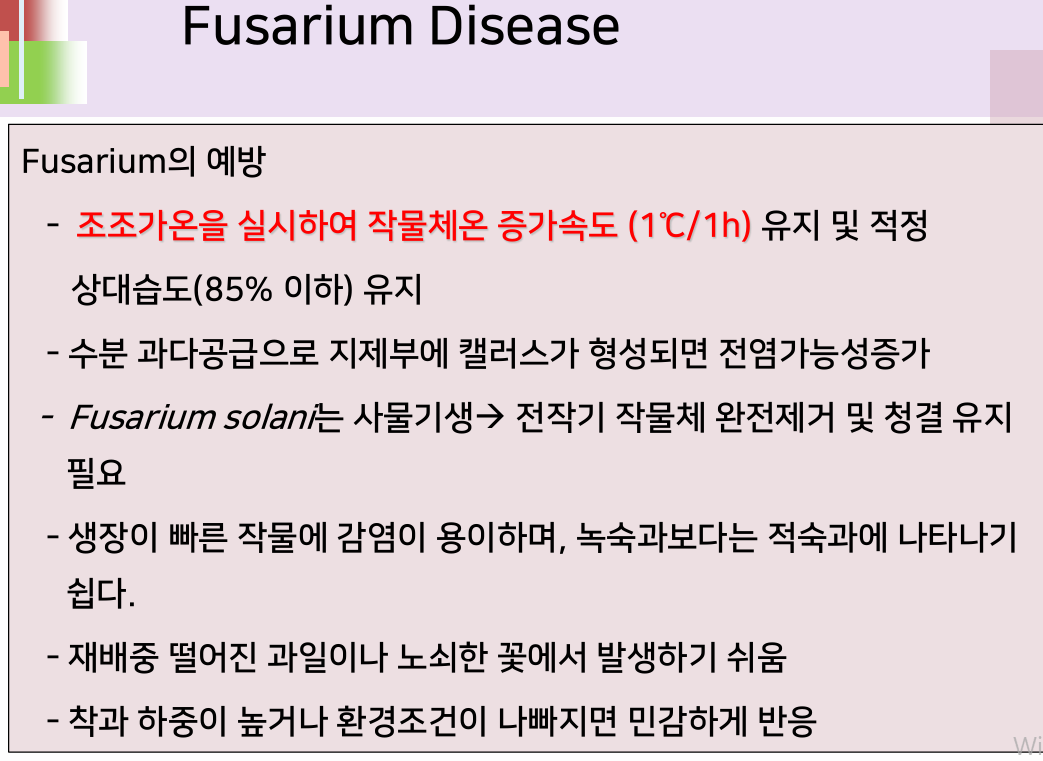 후사리움은 다습환경에서 발병 위험이 크다. 초기 작물은 건강해서 스스로 저항하지만 성장하여 노목이 되고 노출면적이 커지면 본격적으로 위험해진다.